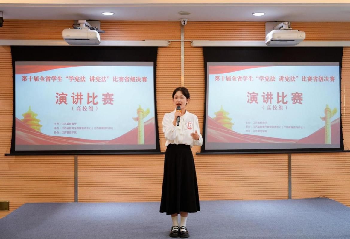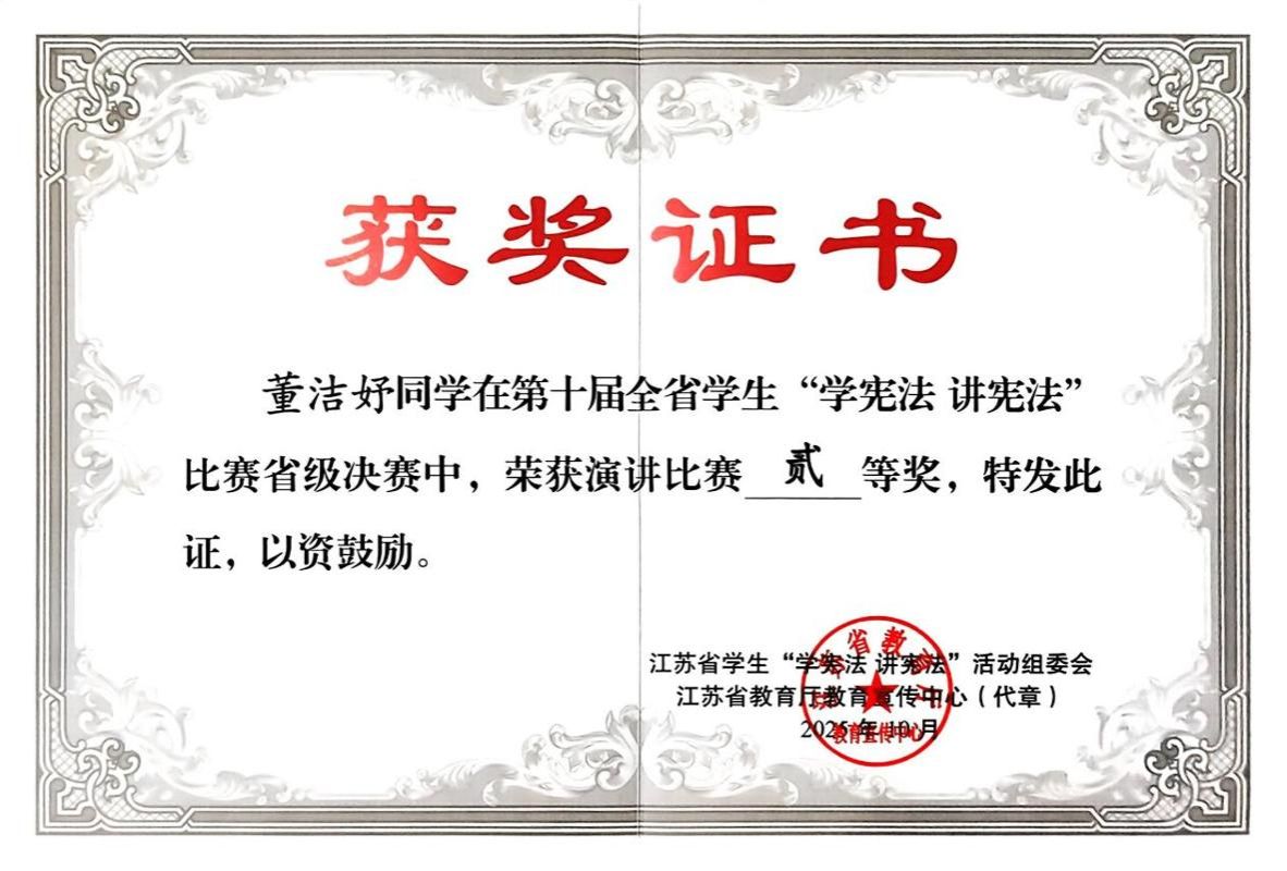 近日,由江苏省教育厅主办,江苏省教育厅教育宣传中心承办,江苏警官学院协办的江苏省第十届全省学生“学宪法 讲宪法”比赛省级决赛在南京圆满闭幕。经过激烈角逐,我校语言文化学院–24应用英语班董洁妤同学凭借稳定的现场发挥,荣获演讲比赛高校组二等奖的优异成绩,吴霜老师获优秀指导教师奖。