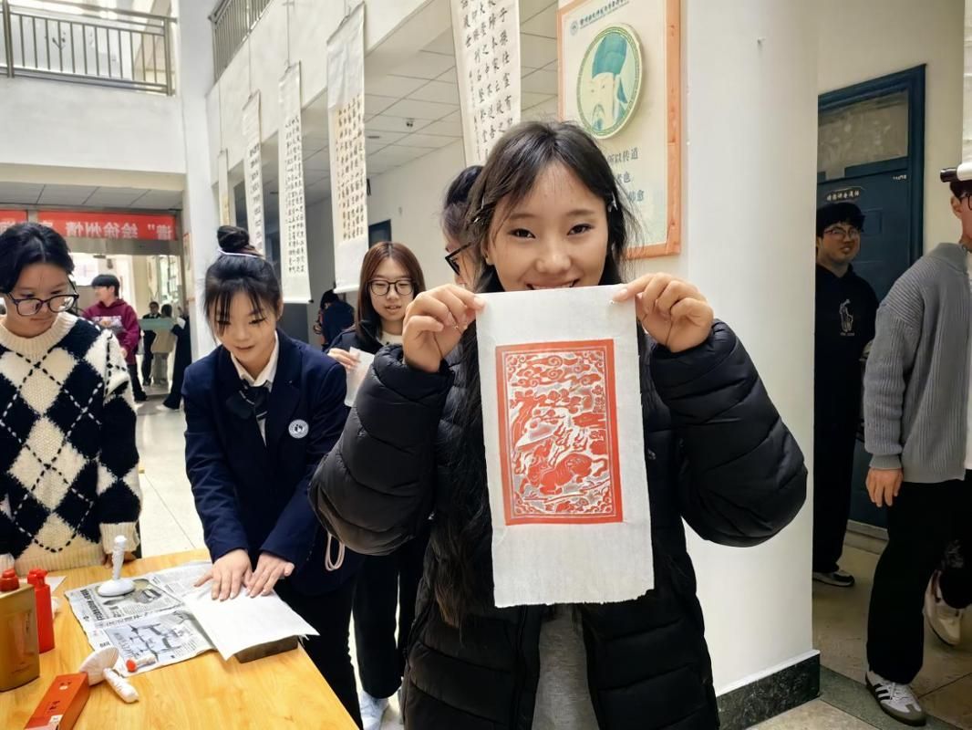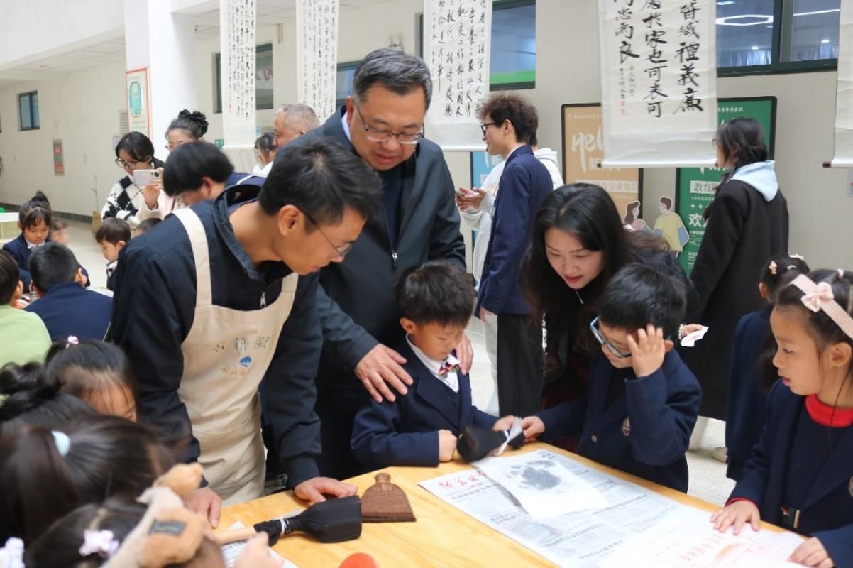 活动现场设有非遗文化体验区,师生和附属幼儿园的小朋友在专业指导下亲身体验传拓与雕版印刷技艺。徐州市图书馆特别准备了按古籍版式设计的雕版工具与寓意丰富的成语图案砖雕,徐州幼专也带来了复刻汉画像石风格的车马出行石雕。同学们在一敲一拓、一印一刷之间,近距离感受传统技艺所蕴含的匠心与智慧。