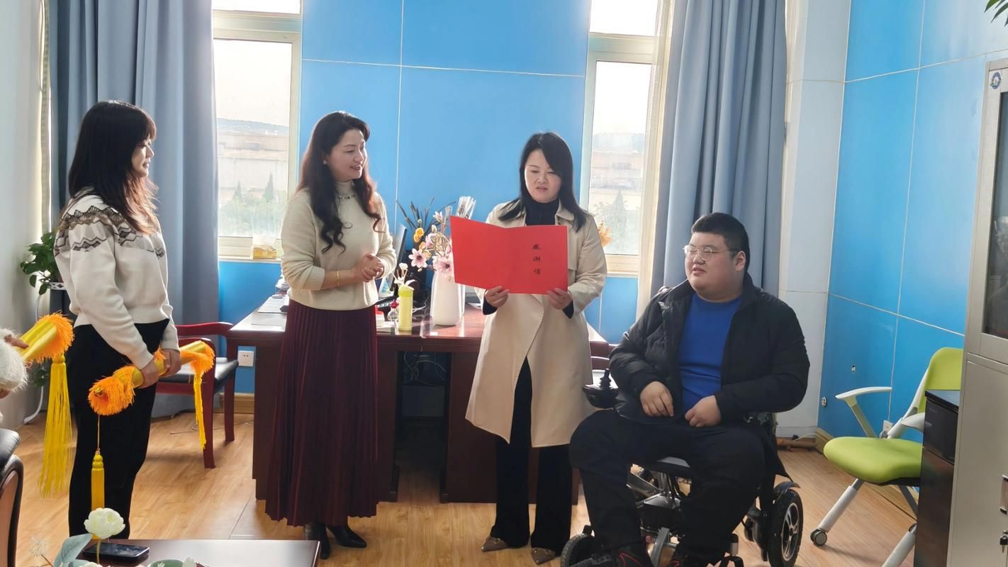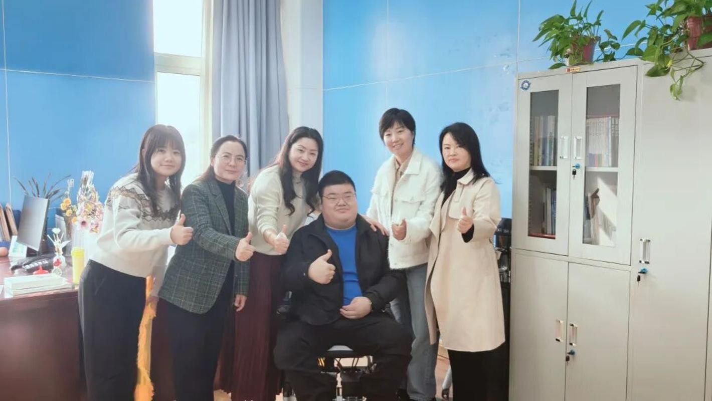 谢盛泽同学身有残疾,求学之路相较常人更为艰辛,但在母亲黄娟女士的悉心呵护和自身的不懈拼搏下,他始终勤勉好学、意志坚定。自入校以来,谢盛泽同学的情况便受到学校领导的高度关注与重视,各部门给予大力支持,推进宿舍改造、无障碍通道铺设等事宜,全力保障其日常出行与起居。语言文化学院更是将这份关爱落到实处,学院领导秉承“崇师、尚美、立人”的校训精神,亲自过问并实地勘测,根据其学习起居相关动线进行统筹布局,为他量身打造了便利的学习和生活环境 —— 班主任在学业上和衣食住行方面给予耐心辅导、持续鼓励,帮助他树立专业学习的信心;宿管阿姨、同班同学及志愿者们则在生活中伸出援手,给予细致入微的照料与陪伴。