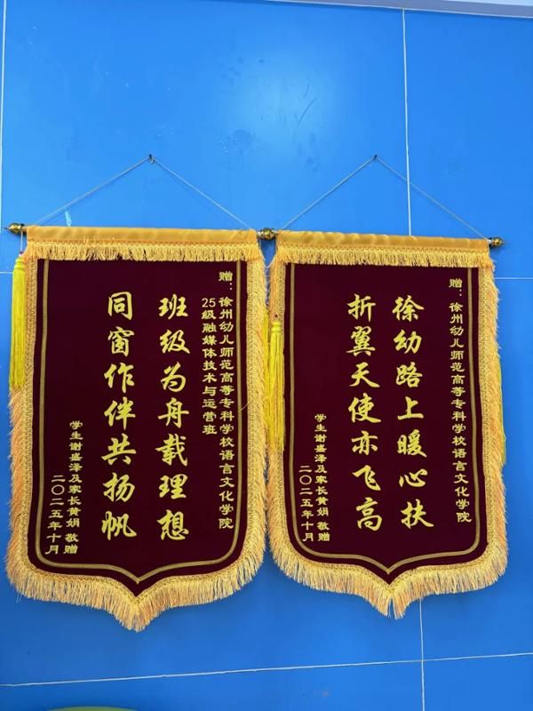 “同窗作伴共扬帆,班级为舟载理想”“徐幼路上暖心扶,折翼天使亦飞高”。11月19日下午,语言文化学院迎来了一场温暖感人的赠旗仪式。25级融媒体技术与运营班学子谢盛泽及其母亲黄娟女士,怀着满心感恩,向学院及所在班级郑重赠送锦旗与感谢信,用最质朴的方式表达对学校和师生们的真挚谢意。