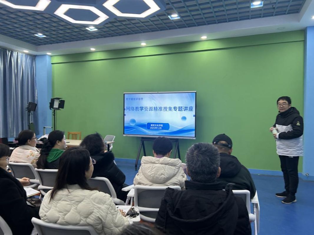 为进一步深化数字化教学改革,提升教师信息获取与资源整合能力,12月17日下午,语言文化学院在A104实训室成功开展数字赋能研修营第二讲——“网络教学资源精准搜集”专题讲座。本次活动由副院长王优主持,张维老师担任主讲,各专业教师积极参与。